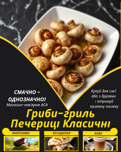 Соковиті Печериці, замариновані в олії з сіллю і чорним перцем та засмажені на грилі, навіть у класичному їх приготуванні однозначно викличуть у вас гастрономічне та естетичне задоволення.