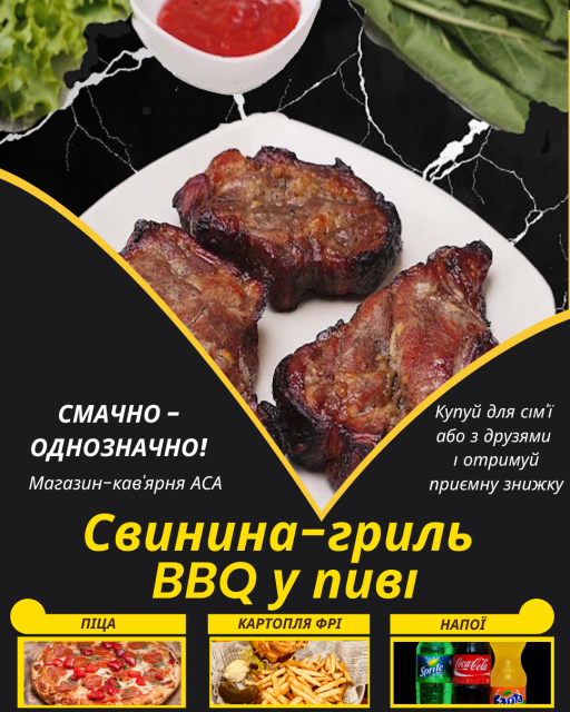 Соковита свинина-гриль зі спеціями у пиві, в поєднанні зі свіжими овочами, соусом BBQ - це справжній смаколик, який викликає апетит під час їжі, та естетичне і гастрономічне задоволення.