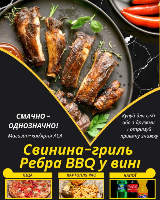 Соковита Свинина-гриль Ребра BBQ у вині, в поєднанні зі свіжими овочами, та соусом - це справжній смаколик, який викликає апетит під час їжі, а також естетичне і гастрономічне задоволення. Червоне столове вино, в якому маринується цей смаколик, у поєднанні зі спеціями, надає страві бомбезного неперевершеного смаку.