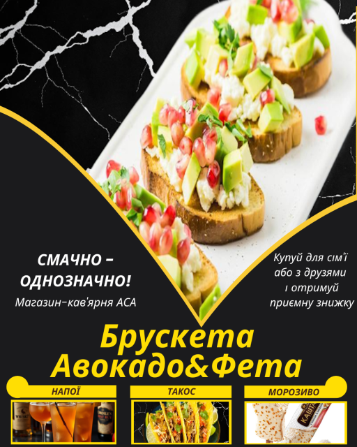 Соковита начинка з оливкової олії, часнику, авокадо, сиру Фета, солі, зерен гранату, петрушки, на хрусткому пласті обсмаженого з обидвох боків багету – тут є все для естетичного та гастрономічного задоволення.