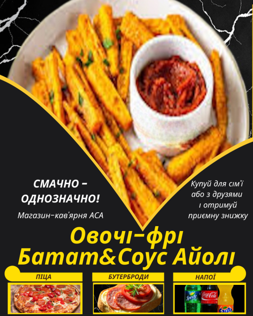 Соковиті бруски солодкого Батату, засмажені у фритюрі до золотистого кольору з усіх боків, разом із смачнючим соусом Айолі – тут є все для естетичного та гастрономічного задоволення.