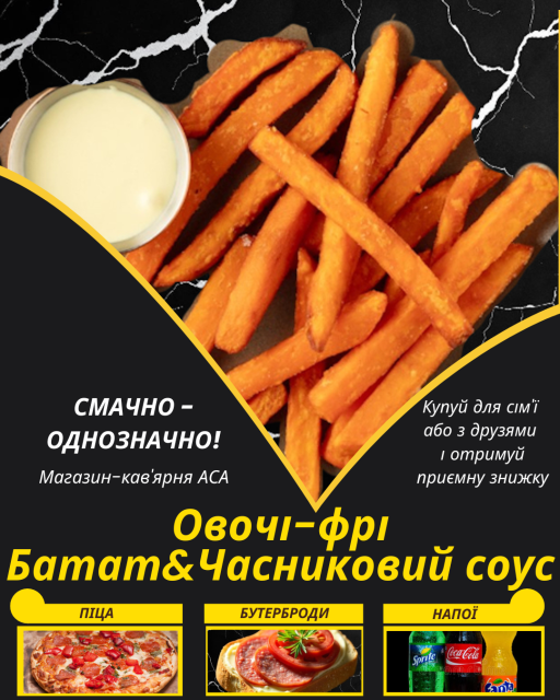 Соковиті бруски солодкого Батату, засмажені у фритюрі до золотистого кольору з усіх боків, разом із смачнючим Часниковим соусом – тут є все для естетичного та гастрономічного задоволення.