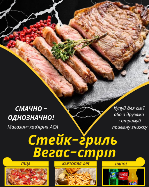 Соковитий яловичий cтейк-гриль Вегас-стріп, замаринований в спеціях, приготований на грилі до бажаної просмажки, в поєднанні з кетчупом або соусом для стейків та свіжими овочами і зеленню - це справжній смаколик, який викликає апетит під час їжі, а також естетичне і гастрономічне задоволення.