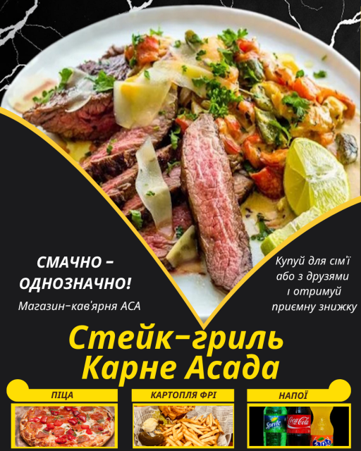 Соковитий яловичий cтейк-гриль Карне Асада, замаринований в спеціях, приготований на грилі до бажаної просмажки, в поєднанні з кетчупом або соусом для стейків та свіжими овочами і зеленню - це справжній смаколик, який викликає апетит під час їжі, а також естетичне і гастрономічне задоволення.