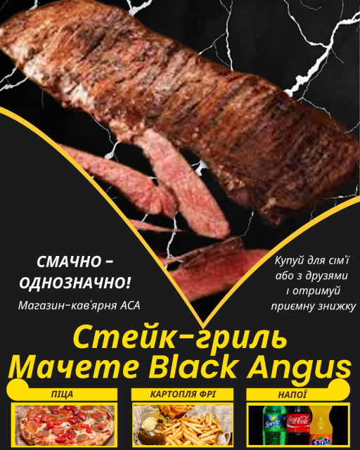 Соковитий яловичий Стейк-гриль Мачете Black Angus, замаринований в спеціях, приготований на грилі до бажаної просмажки, в поєднанні з кетчупом або соусом для стейків та свіжими овочами і зеленню - це справжній смаколик, який викликає апетит під час їжі, а також естетичне і гастрономічне задоволення.