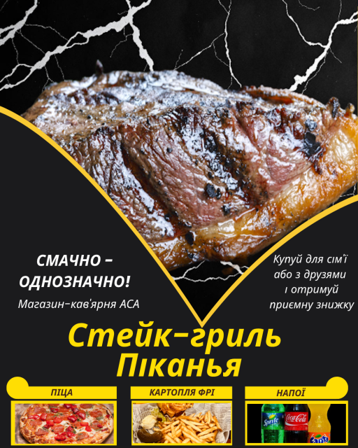 Соковитий яловичий Стейк-гриль Піканья, замаринований в спеціях, приготований на грилі до бажаної просмажки, в поєднанні з кетчупом або соусом для стейків та свіжими овочами і зеленню - це справжній смаколик, який викликає апетит під час їжі, а також естетичне і гастрономічне задоволення.