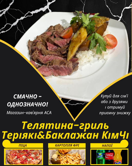 Соковита Телятина-гриль Теріякі&Баклажан КімЧі, замаринована в спеціях, приготована на грилі, в поєднанні з соусом Кім Чі та зеленню кінзи - це справжній смаколик, який викликає апетит під час їжі, а також естетичне і гастрономічне задоволення.