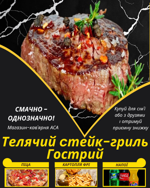 Соковитий Телячий cтейк-гриль Гострий, замаринований в спеціях, приготований на грилі, в поєднанні з соусом та свіжими овочами - це справжній смаколик, який викликає апетит під час їжі, а також естетичне і гастрономічне задоволення.
