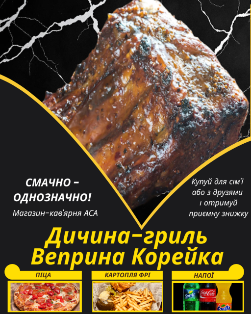 Соковита Дичина-гриль Веприна Корейка, замаринована в спеціях, приготована на грилі до бажаної просмажки, в поєднанні з кетчупом або соусом та свіжими овочами і зеленню - це справжній смаколик, який викликає апетит під час їжі, а також естетичне і гастрономічне задоволення.