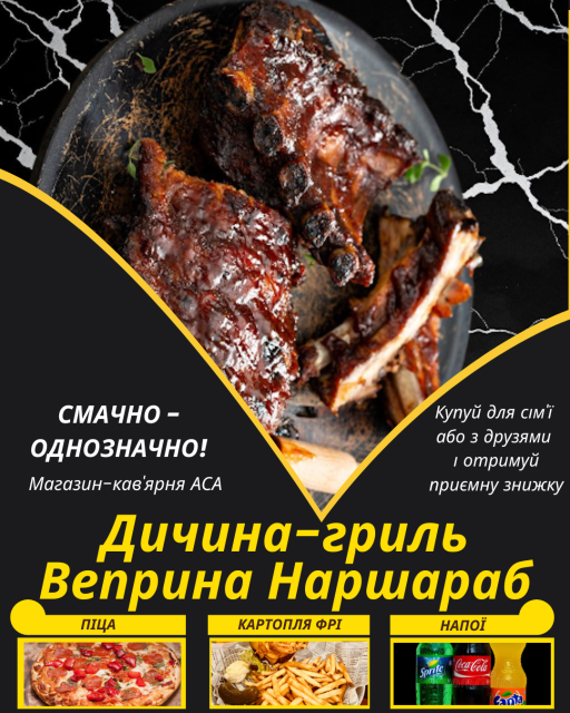 Соковита Дичина-гриль Веприна Наршараб, замаринована в спеціях, приготована на грилі до бажаної просмажки, в поєднанні з кетчупом або соусом та свіжими овочами і зеленню - це справжній смаколик, який викликає апетит під час їжі, а також естетичне і гастрономічне задоволення.