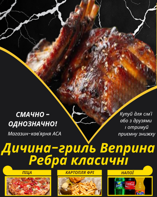 Соковита Дичина-гриль Веприна Ребра класичні, замаринована в спеціях, приготована на грилі до бажаної просмажки, в поєднанні з кетчупом або соусом та свіжими овочами і зеленню - це справжній смаколик, який викликає апетит під час їжі, а також естетичне і гастрономічне задоволення.