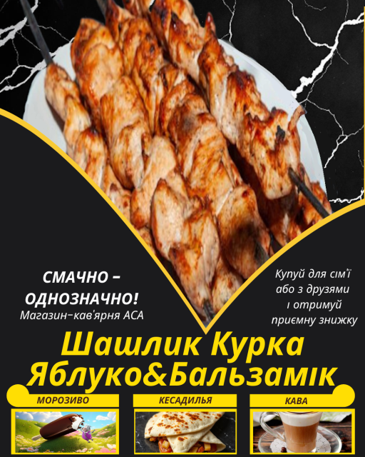 Соковитий Шашлик Курка Яблуко&Бальзамік, замаринований в спеціях, та приготований з любов'ю до людей і до своєї справи – тут є все для естетичного та гастрономічного задоволення.