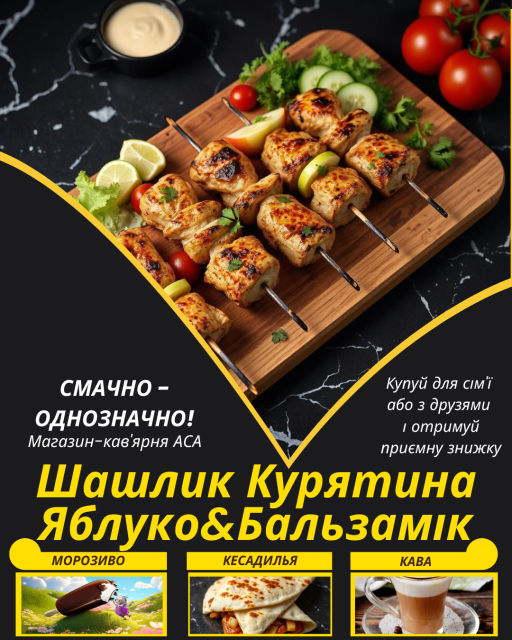 Соковитий Шашлик Курятина Яблуко&Бальзамік, замаринований в спеціях, та приготований з любов'ю до людей і до своєї справи – тут є все для естетичного та гастрономічного задоволення.