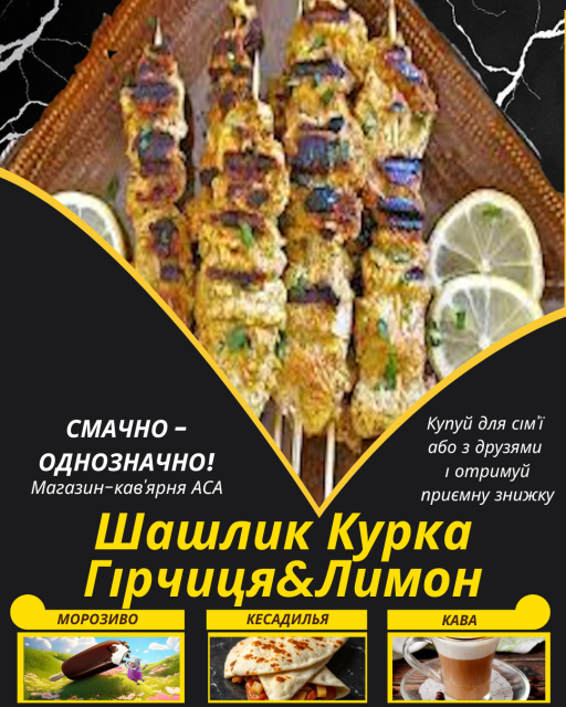 Соковитий Шашлик Курка Гірчиця&Лимон, замаринований в спеціях, та приготований з любов'ю до людей і до своєї справи – тут є все для естетичного та гастрономічного задоволення.