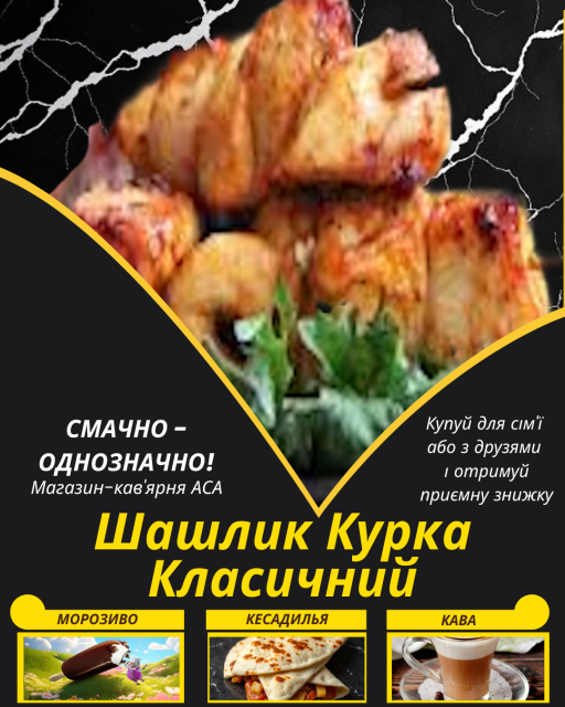 Соковитий Шашлик Курка Класичний, замаринований в спеціях, та приготований з любов'ю до людей і до своєї справи – тут є все для естетичного та гастрономічного задоволення.