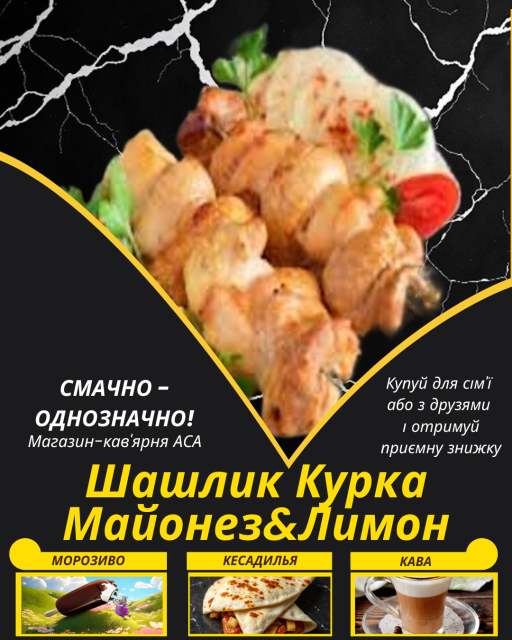 Соковитий Шашлик Курка Майонез&Лимон, замаринований в спеціях, та приготований з любов'ю до людей і до своєї справи – тут є все для естетичного та гастрономічного задоволення.