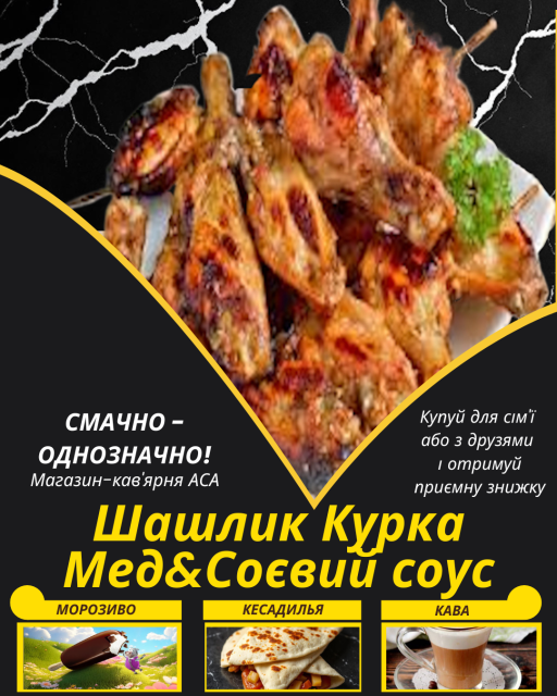 Соковитий Шашлик Курка Мед&Соєвий соус, замаринований в спеціях, та приготований з любов'ю до людей і до своєї справи – тут є все для естетичного та гастрономічного задоволення.