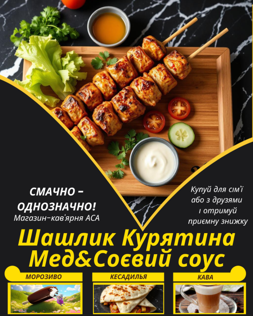 Соковитий Шашлик Курятина Мед&Соєвий соус, замаринований в спеціях, та приготований з любов'ю до людей і до своєї справи – тут є все для естетичного та гастрономічного задоволення.