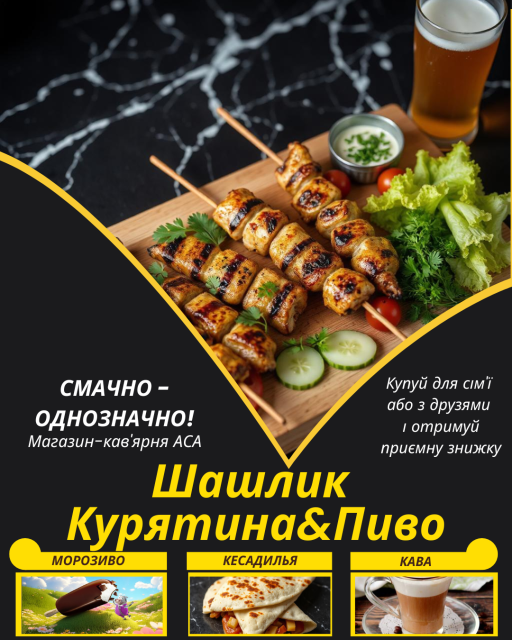 Соковитий Шашлик Курятина&Пиво, замаринований в спеціях, та приготований з любов'ю до людей і до своєї справи – тут є все для естетичного та гастрономічного задоволення.