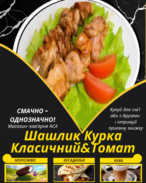 Соковитий Шашлик Курка Класичний&Томат, замаринований в спеціях, та приготований з любов'ю до людей і до своєї справи – тут є все для естетичного та гастрономічного задоволення.