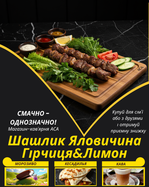Соковитий Шашлик Яловичина Гірчиця&Лимон, замаринований в спеціях, та приготований з любов'ю до людей і до своєї справи – тут є все для естетичного та гастрономічного задоволення.
