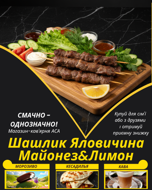 Соковитий Шашлик Яловичина Майонез&Лимон, замаринований в спеціях, та приготований з любов'ю до людей і до своєї справи – тут є все для естетичного та гастрономічного задоволення.