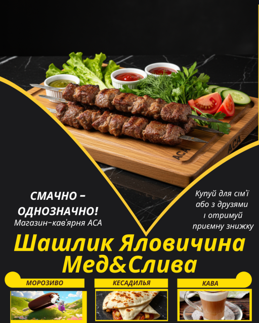 Соковитий Шашлик Яловичина Мед&Слива, замаринований в спеціях, та приготований з любов'ю до людей і до своєї справи – тут є все для естетичного та гастрономічного задоволення.