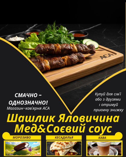 Соковитий Шашлик Яловичина Мед&Соєвий соус, замаринований в спеціях, та приготований з любов'ю до людей і до своєї справи – тут є все для естетичного та гастрономічного задоволення.