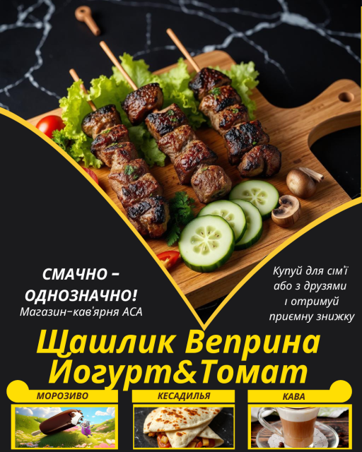 Соковитий Шашлик Веприна Йогурт&Томат, з м'яса дикого кабана (вепра), замаринований в томатно-йогуртному маринаді зі спеціями, та приготований з любов'ю до людей і до своєї справи – тут є все для естетичного та гастрономічного задоволення.