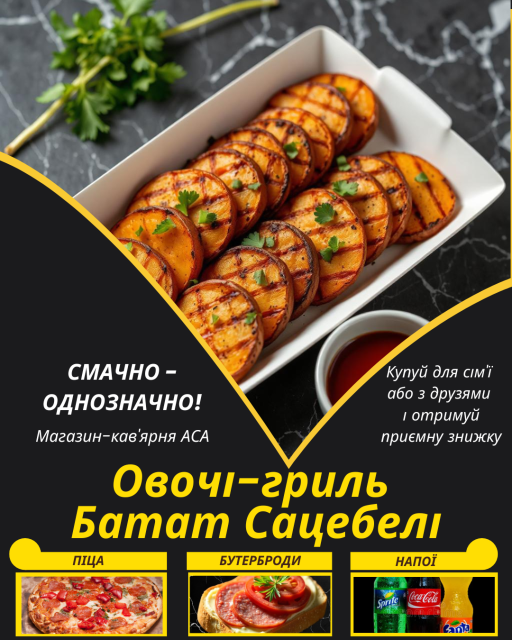 Соковитий Батат, засмажений на грилі до золотистого кольору з усіх боків, разом із смачнючим соусом Сацебелі – тут є все для естетичного та гастрономічного задоволення.